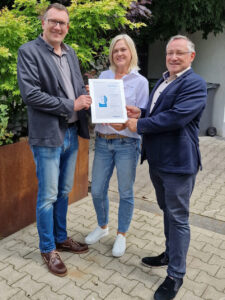 Das Bild zeigt rechts Herrn Dirk Pfeiffer von der Creditreform Freiburg/Offenburg Zimmermann bei der Übergabe.